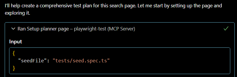 まずは seed.spec.ts を開いた状態で、Copilotから Planner を選び、次のプロンプトを入力します。プロンプトはテスト内容に合わせて変えてください。