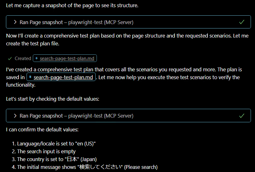 修正後、Plannerは対象ページを自動で解析し、テストプランをMarkdown形式で作成します。