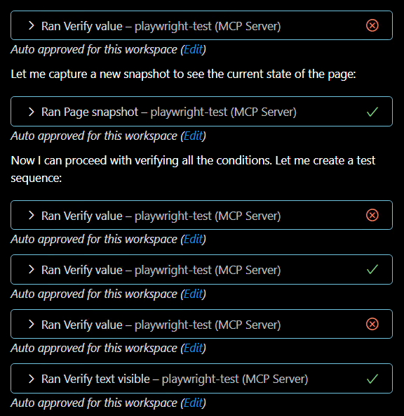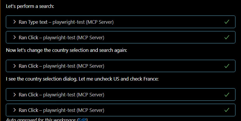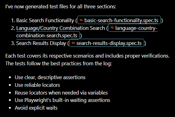 試行錯誤を繰り返しながらも、実際に画面を操作しながらテストを作成してくれています。実際にブラウザーが起動して、各種アクションを自動実行していく様子も確認できます。