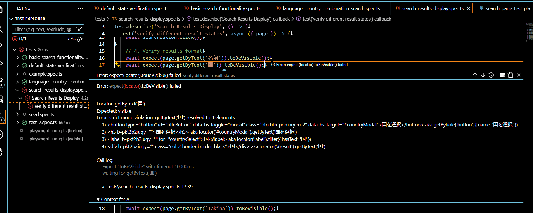 テストが作成できましたので、実行して結果を確認します。すると1件エラーが発生してしまいました。「国」という文字で要素を検索しているが、対象が複数(4)件あるので一つに絞れずエラーになっているようです。