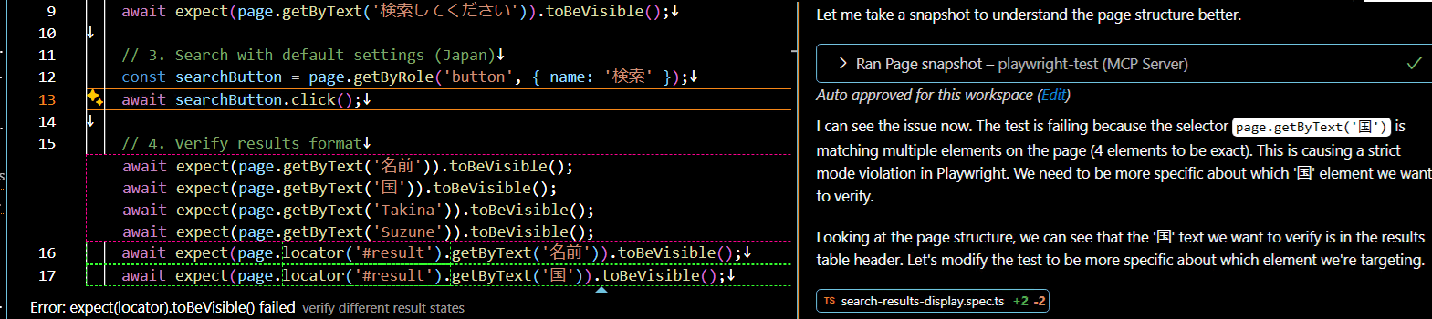 生成されたテストは当然エラーが発生することもあります。そんなときは Healer 機能の出番です。エラーが出たテストファイルを開いたまま、エージェントをHealerに変更して次のプロンプトを入力します。