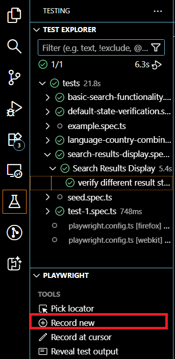 Record New をクリックすると、test-1.spec.ts が生成され、記録用ブラウザが起動します。